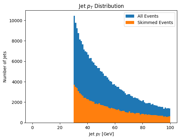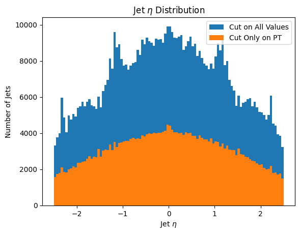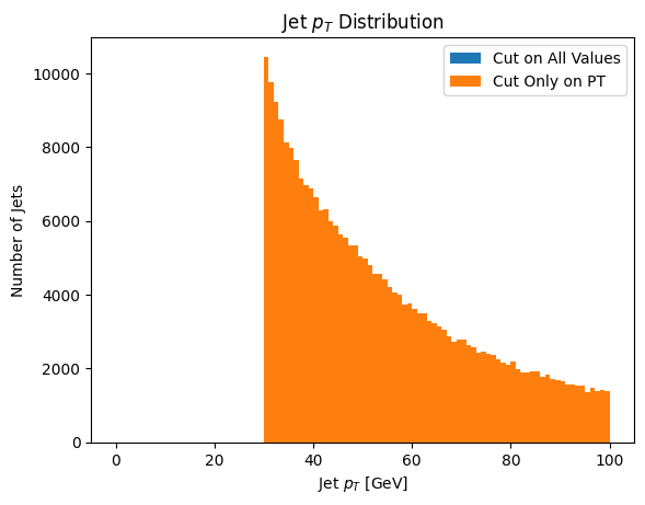 The plot above shows that the Jet pt data is identical from both methods of applying the cut. This is what is expected.